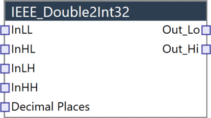Funkcja wykonuje operacje przekonwertowania liczby zapisanej w formacie zmiennoprzecinkowym Double na Int32. Wejście Decimal Places określa mnożnik dziesiętny liczby. Np. wartość wejściowa = 0.1, Decimal Places = 1, Out = 1.