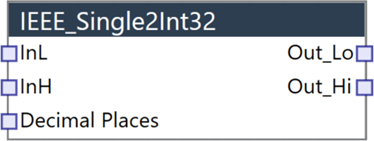 Funkcja wykonuje operacje przekonwertowania liczby zapisanej w formacie zmiennoprzecinkowy typu Single na Int32. Wejście Decimal Places określa mnożnik dziesiętny liczby. Np. wartość wejściowa = 0,1, Decimal Places = 1, Out = 1.