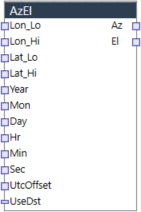 Bloczek wyznacza azymut i elewację Słońca na podstawie aktualnej pozycji geograficznej oraz dokładnego czasu. Dokładny czas systemowy można pobrać ze sterownika za pomocą bloczka CalendarClock.